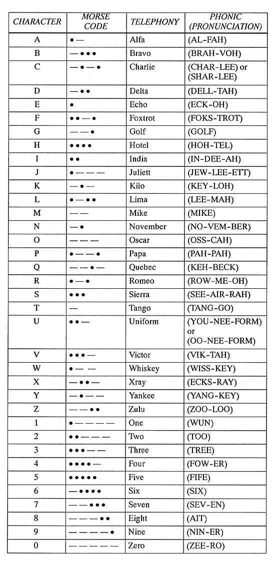 Below are listed morse code plus a few phonetic alphabets.